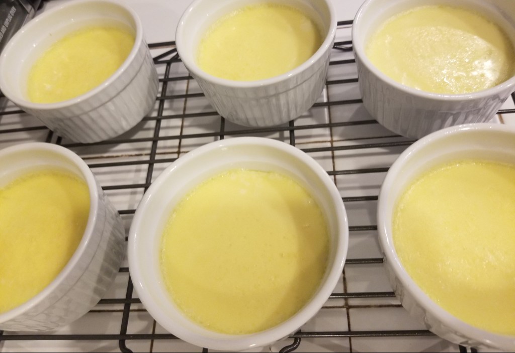 7. When set, take the pan out of the oven, carefully remove the ramekins from the pan with a hot pad or tongs, and set them on a cooling rack. When cool, put them in the fridge overnight so the caramel flavor is absorbed into the custard.