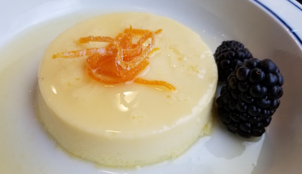 A not-quite-golden caramel on my crème caramel, garnished with blackberries and candied orange zest