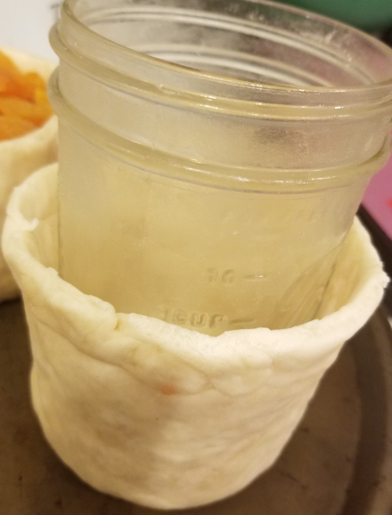 4. Wrap a piece of plastic wrap around two clean, empty, straight-sided jars (Pint-sized, wide-mouthed canning jars work well.). Remove a quarter of the pastry and reserve for the lids of the pies. With the remaining three-quarters of the pastry, divide in two and place half on a flat surface. Flatten it into a circle about 4-5 inches in diameter. Place one jar in the center of the pastry and press down, then flip the jar upside down with the pastry on top. Sculpt the still warm pastry around the jar, bringing the pastry down the sides of the jar. Try to make sure the pastry is an even thickness all around. Make sure the bottom is not too thick and that there are no holes in the pastry. Repeat with the other half of the dough and the other jar.
