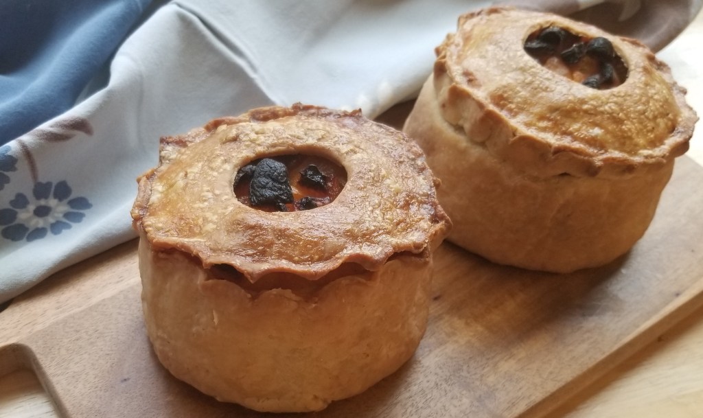The hardest part about letting them set overnight was that the house smelled wonderful—the scent of bacon and chicken mingling with baking pastry—but we were unable to try it until morning. So I wasn’t surprised when my husband jumped at the chance to have meat pies for breakfast! (Apparently that’s a thing in Leicestershire on Christmas, so why not start a new tradition in Wisconsin on a normal weekday!)