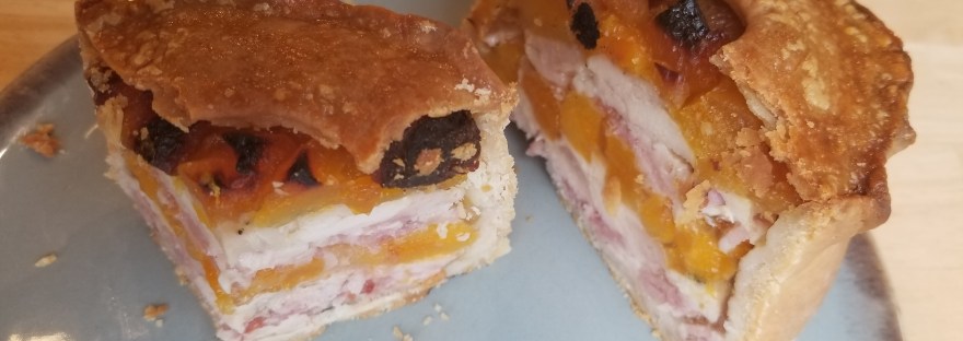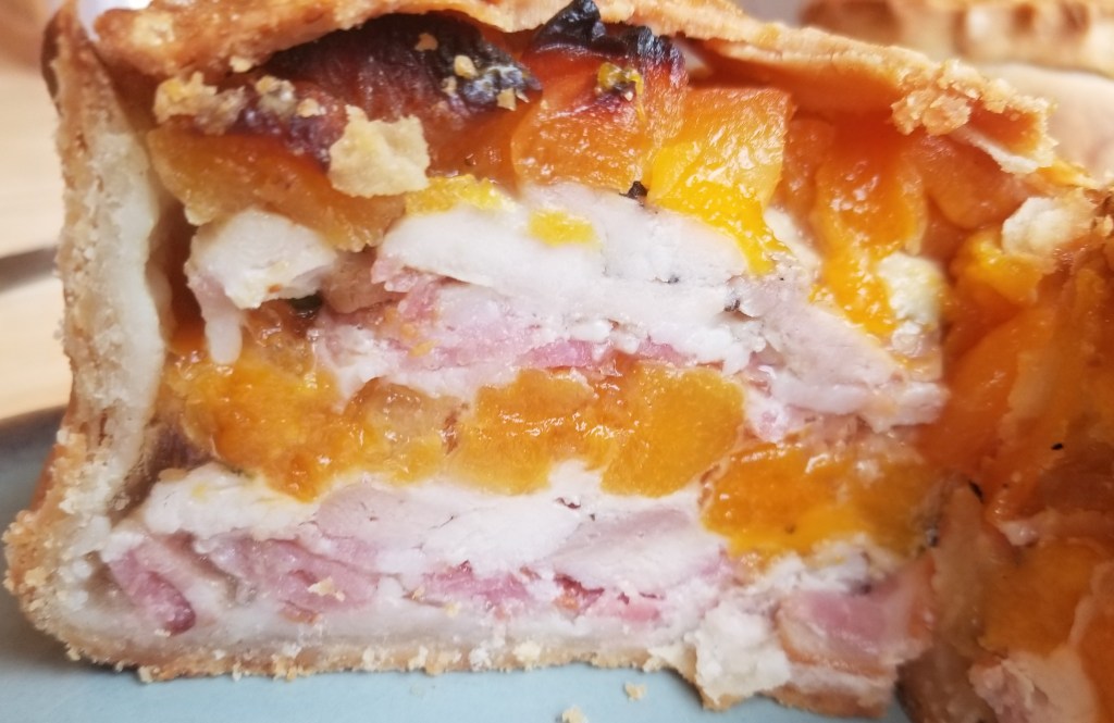 I was surprised that everything goes in raw. It’s layered—bacon, chicken, apricots, repeat—and then topped with a lid of pastry that has a hole in the center for steam to escape. The lid should fit inside the casing, not on top, and it should be well-sealed and crimped around the edges so the filling won’t leak out.