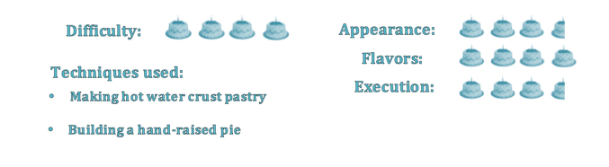 But they are hearty, and sturdy, as long as you can get the pastry to cooperate. Hand-raised pies use a hot water crust pastry, which is made with boiling water and lard. Before you get too grossed out about using lard in this day and age of healthy eating and avoiding saturated fats, be aware that lard is in most refrigerated and frozen pie crusts you’ll find in the grocery store. If you’re like me and have one in your freezer right now (just for emergencies, of course!), go check the label. It’s there, trust me.