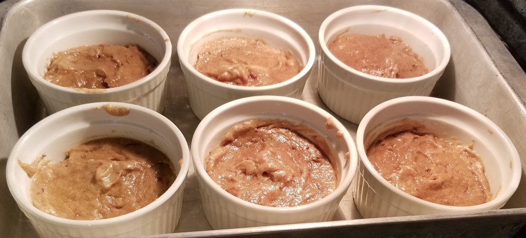 I decided to make a traditional sticky toffee pudding, mostly because Iโd never tried one before and I wanted to know how it tasted. So I found what looked like a typical recipe on foodandwine.com that is baked in six individual ramekins, but I chose to use the sauce from a different sticky toffee pudding recipe I found on tworedbowls.com, partly because it uses mascarpone instead of cream, and I needed to use up the mascarpone I bought for last weekโs bake.