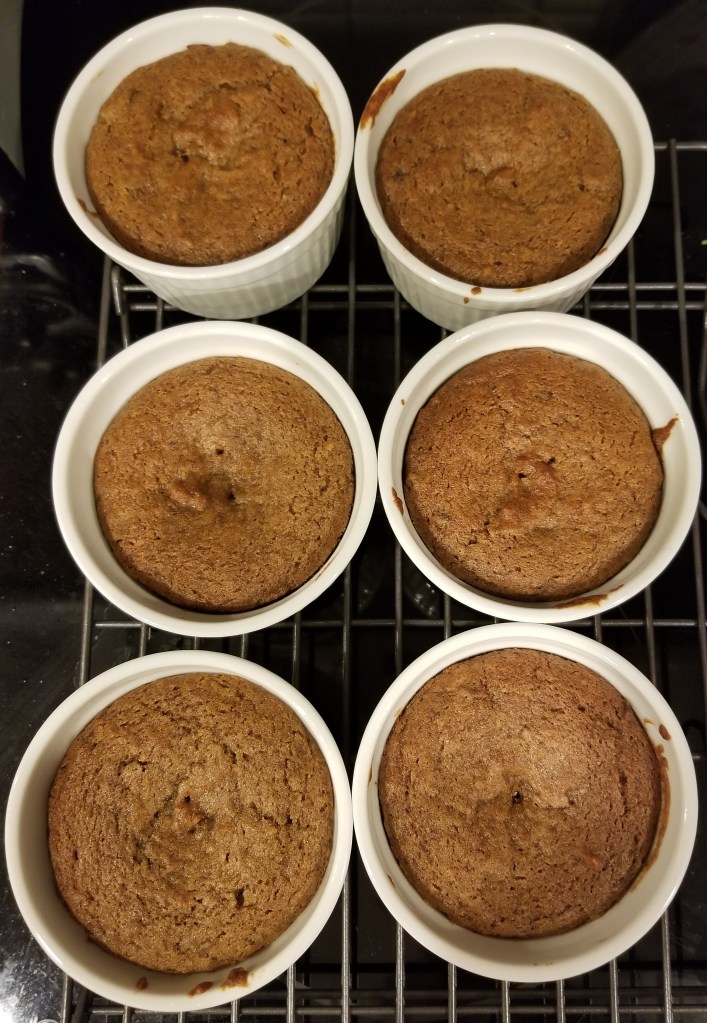 4. Spoon batter into the prepared ramekins and smooth the surface. Bake for 20 minutes or until a toothpick inserted into the centers comes out clean. Let puddings cool for 5 minutes, then run a knife around the inside of each ramekin and invert onto a dessert plate.