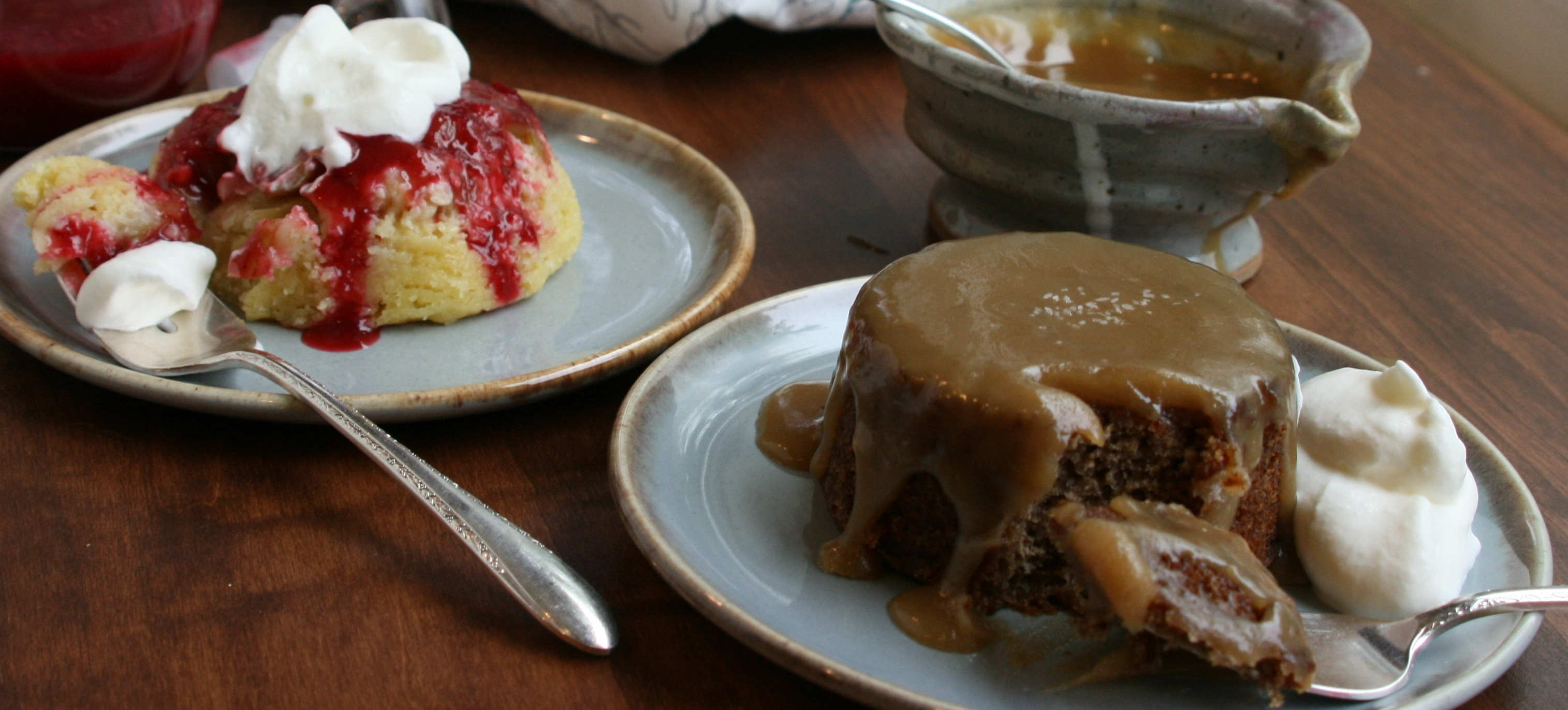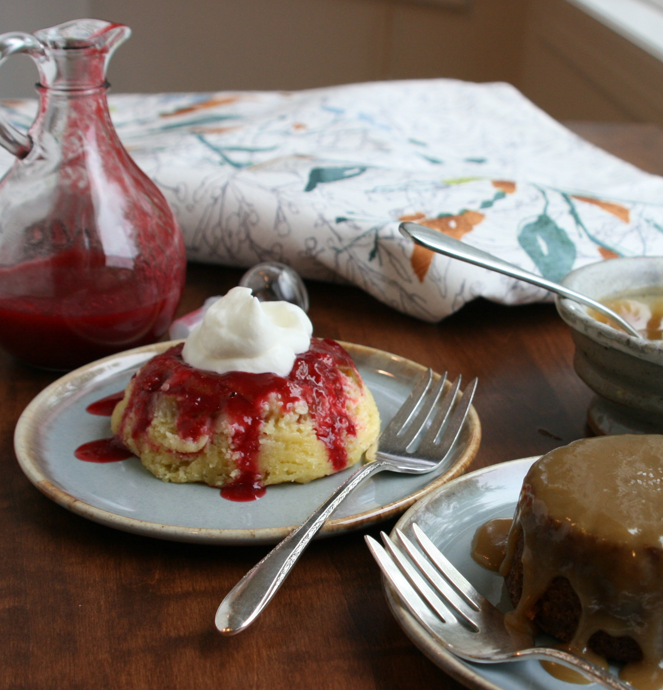 I call this bake my Spring and Fall Puddings. Rhubarb is a quintessential flavor of spring, and the lighter sponge and fruity sauce make it ideal for warmer weather, while the sticky toffee reminds me of caramel apples and the comfort food we crave when the weather turns cold. I hope youโll try them both!