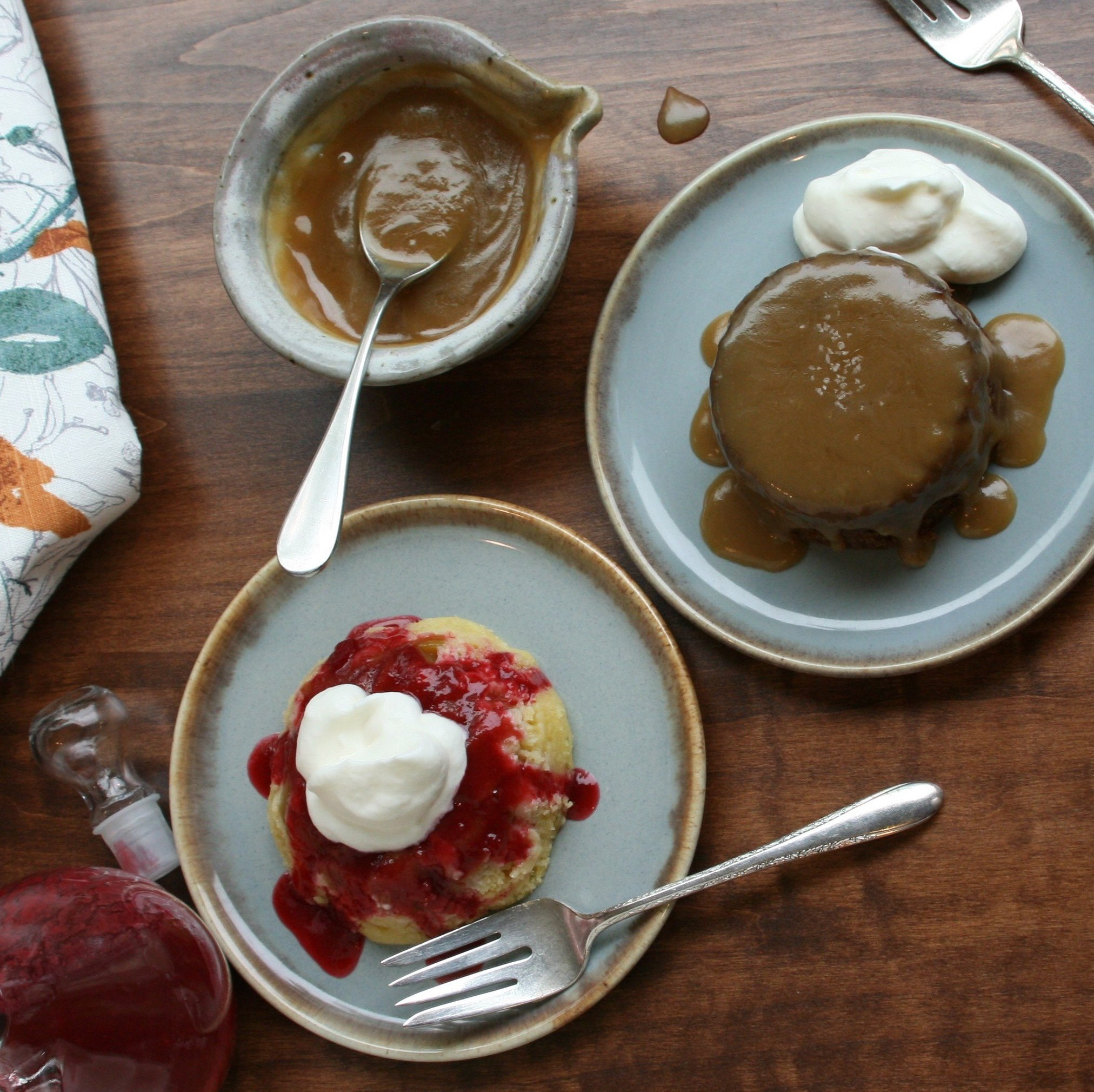 The one change I made to the main recipe is that I didnโt add the sauce to the sponges mid-bake but waited until just before serving. This is because I was afraid they would turn out too sweet if I sauced them in the baking dish, and I wanted everyone to be able to add as much or as little extra sweetness as they liked.