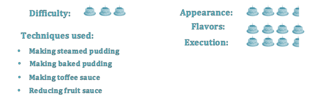 These were not difficult bakes, but I ran into difficulties with the steamed pudding. Although I followed the directions for individual puddings that were attached to this recipe, baking them in a bain-marie for nearly 35 minutes until my inserted toothpick came out clean, two of my puddings collapsed when turned out of the pans. (I felt much like Danny when she had to serve her Jubilee Chocolate Fondants to Paul and Mary in this episode of GBBO, even though two of them fell on the floor.)
