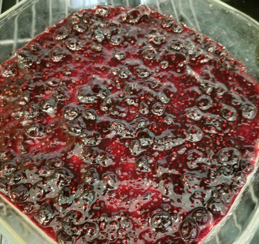 While the custard bakes, you can make the jam simply by cooking sugar and fresh or frozen fruit on the stove until it’s thickened. If using frozen fruit (which I did), it will take longer, so bring it to a boil, stirring until the sugar dissolves, and then let it bubble lightly for about 20 minutes. I found this helpful article on making jam without pectin, and it gives a simple test that uses a cold spoon to tell if the jam is done.