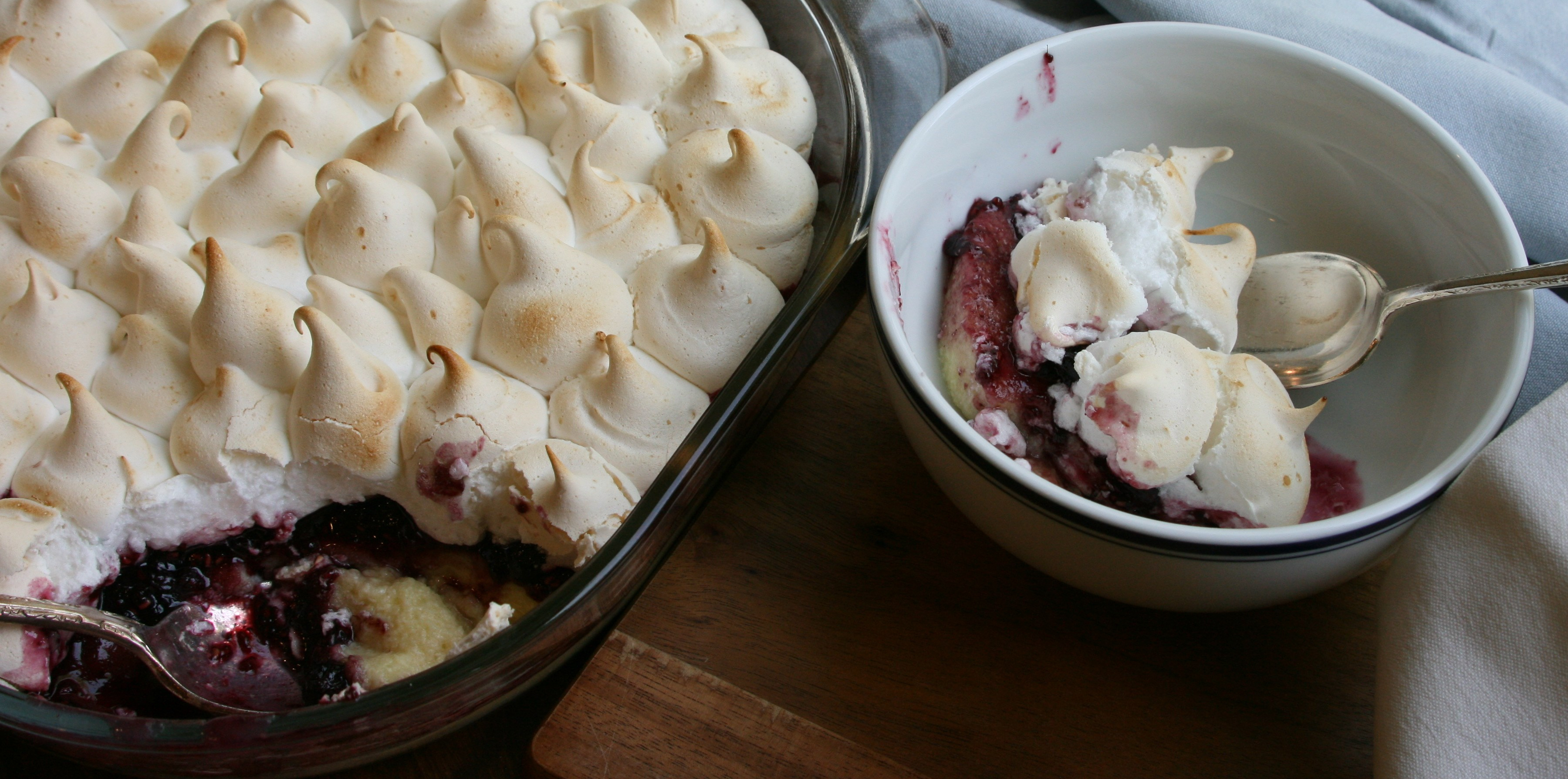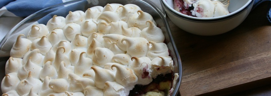 So this technical challenge from Mary Berry’s repertoire starts with a layer of breadcrumbs (white, no crusts) in a buttered casserole. For the custard, you must heat milk with butter, lemon zest and sugar until the butter is all melted and you can just barely put your finger in (something I learned from Mary when I made her Crème Caramel.) Whisk the egg yolks in another bowl, and continue whisking while slowly pouring in the warm milk. When that is well combined, pour the egg/milk mixture over the breadcrumbs and let them sit for about 15 minutes to soak up the liquid. Bake that in a bain-marie for about half an hour, till it’s set but still has a bit of a wobble.