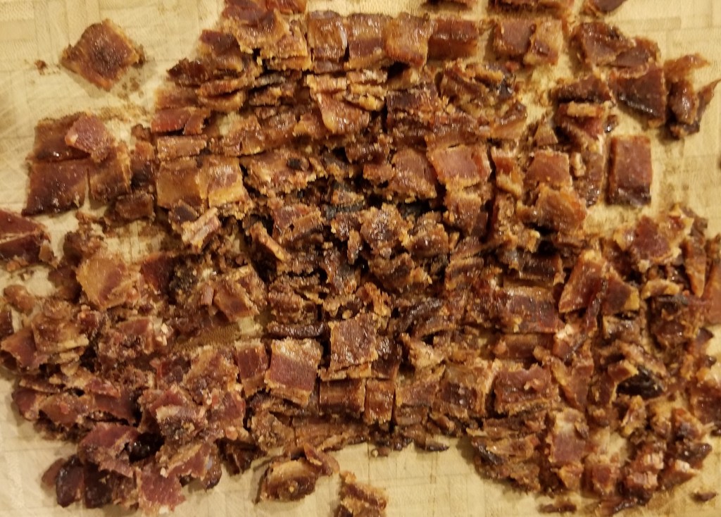 - Mix syrup and spices together. Brush half of mixture onto bacon slices. Bake for 10 minutes. Remove pan from oven and use tongs to turn each piece over. Brush with remaining syrup mixture. Return to oven for 10-15 more minutes or until bacon is dark and crispy. Let cool on rack, then dice into ¼- to ½-inch pieces.