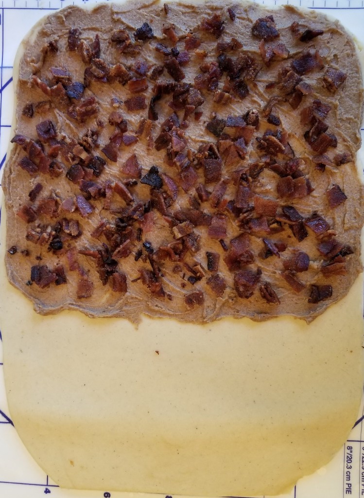 - Roll out the first half of the dough to a ¼-inch thick rectangle, about 12×16 inches. Spread half the filling over two-thirds of the rectangle, then sprinkle the same portion with half of the diced bacon. Fold the plain third in, then fold the opposite third over that (like folding an envelope). Roll to a rectangle about 12×8 inches and ½-inch thick. Slice lengthwise into strips about 1 inch wide. (For smaller rolls, cut about ¾-inch wide strips.)