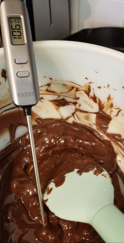 Although I tried to work on all three simultaneously, I probably should have thought it through more carefully. For instance, I decided to start by tempering my chocolate, but I forgot that the pastry dough has to chill for an hour before being rolled out, and then should be chilled again before baking. So I probably should have begun with the pastry dough, then started the raspberry jam for the chocolate mousse cups, since it can simmer on the stove while you’re doing other things. Then I could have been tempering my chocolate while my dough was chilling and my jam was simmering.