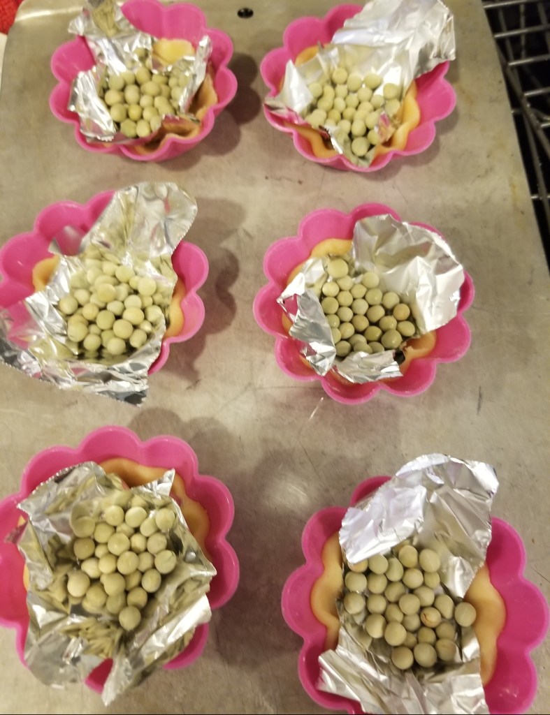 - Place a small piece of foil inside the unbaked shells, and add a small handful of pie weights or dry beans to each shell. Transfer baking sheet to the middle rack of the oven and bake for 8-12 minutes or until shells are slightly golden brown around the edges. Remove baking sheet from oven and gently remove the foil with the pie weights from the molds. Carefully transfer molds to a cooling rack and cool to room temperature before removing pastry shells from the molds.