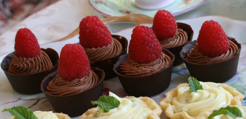 - Transfer whipped ganache to a piping bag fitted with a small star tip. Fill the chocolate cups with whipped ganache. Top each with a single raspberry for garnish. Refrigerate until ready to serve.