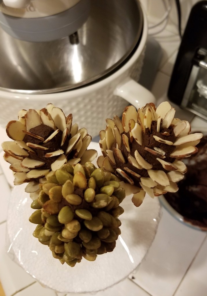 For the pine cones, I started by forming a small egg-shaped core out of ganache. (This gets messy, so either wear food-safe gloves or just embrace it, like a kid making mud pies!) I then stuck it on a bamboo skewer so I’d have something to hold onto while I inserted almond slices all around it. When I thought it had enough almond slices to make it look like a pine cone, I sprinkled it with cocoa powder to give it a more realistic look. I made two pine cones with almond slices and one with roasted pumpkin seeds, also called pepitas, which are green and smaller than almonds, so it looked like a younger pinecone that hadn’t fully opened up yet.