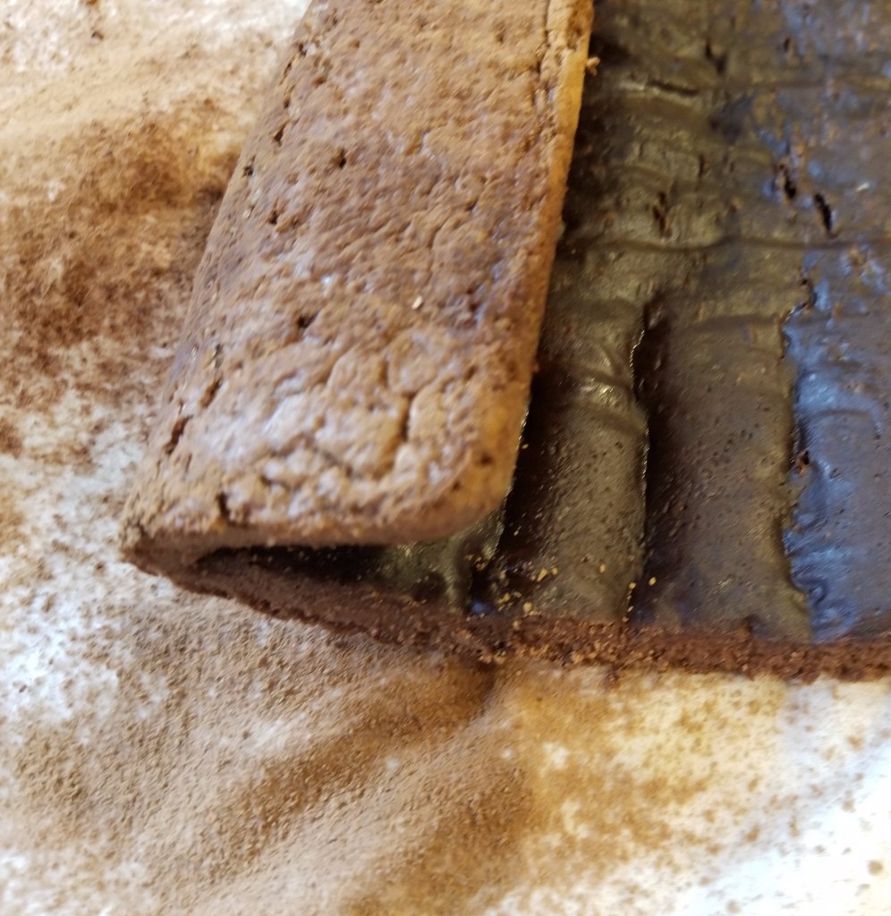 After that, the flour and chocolate are gently folded into the aerated egg mixture, in stages, so as not to deflate the eggs. Finally, a small amount of melted butter is folded in, and then the batter is spread into a parchment-lined jelly roll pan and spread evenly, since it won’t spread on its own in the oven.