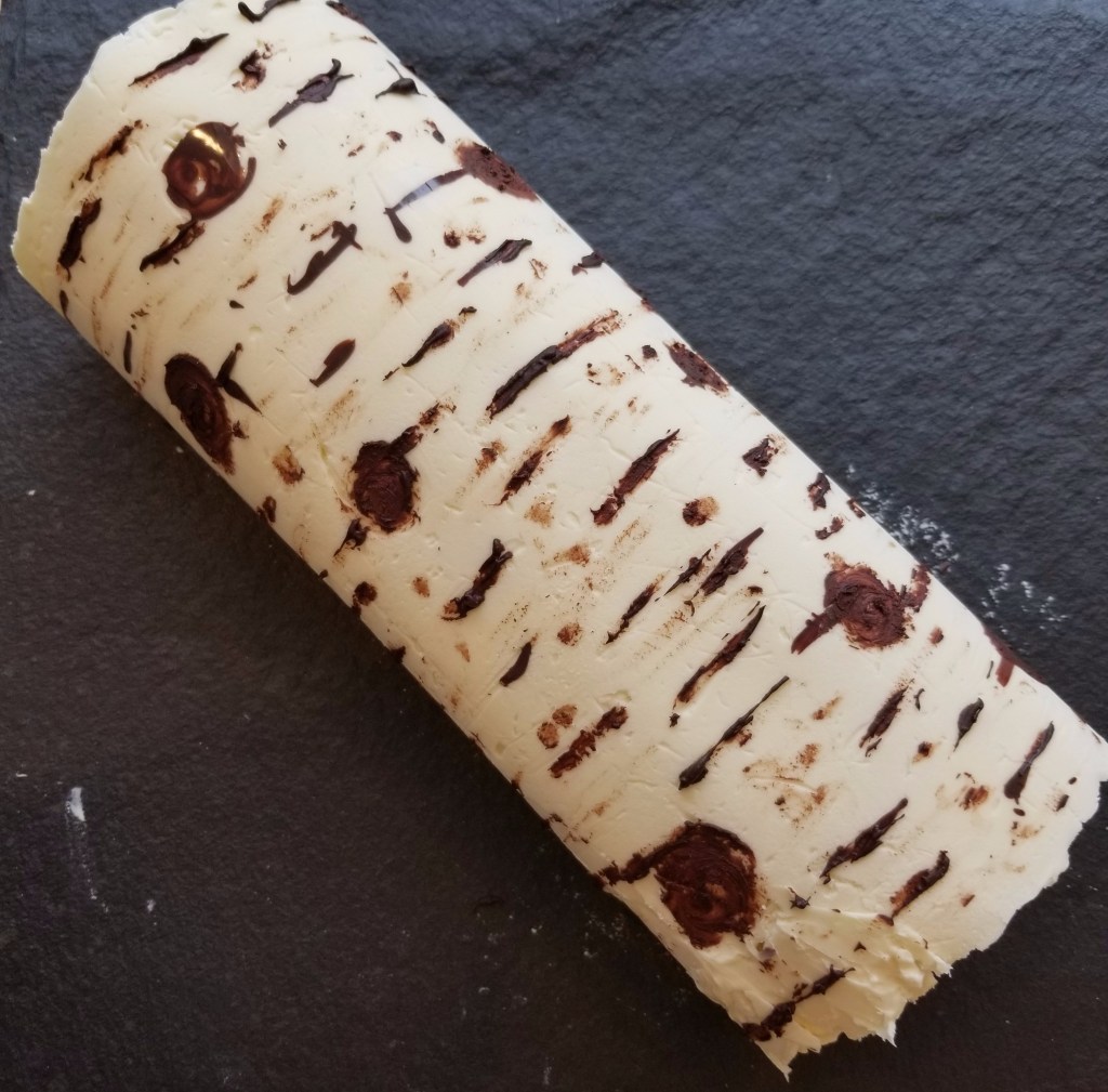 It didn’t take long for the chocolate to cool and harden enough for me to pick it up and wrap it around my chilled roulade. When I felt that it had set enough, I gently lifted a corner of the acetate and slowly peeled it off the chocolate. I could tell right away that something was wrong. The dark chocolate stuck to the acetate instead of the white chocolate! I tried rubbing it, like those old rub-on transfers we used to play with as kids. That didn’t work, so I gave up and kept peeling. At least the white chocolate didn’t stick to the acetate. So I decided to paint the birch pattern directly onto the white chocolate collar. This worked fairly well, and I was satisfied with the outcome. The only problem with the white chocolate was that it wasn’t shiny. I chalked that up to allowing it to get too hot during the tempering. But as it turned out, it looked more realistic this way.