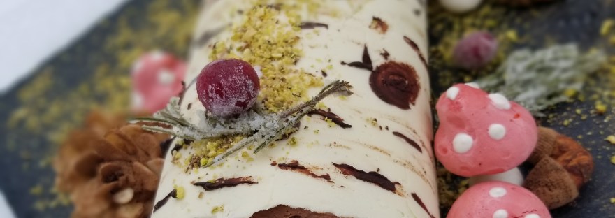 I guess I’m still in the Christmas mood. When I saw that this week’s challenge was a chocolate cake, all I could think of was Bûche de Noël. A friend of mine had shown me her holiday issue of Bake From Scratch magazine, and it featured a couple different versions of this Christmas classic, as well as a clever use of white chocolate to create a “birch bark” bark. I borrowed her magazine to use the Classic Bûche de Noël recipe as the basis for my showstopper, but I put my own take on the rest.