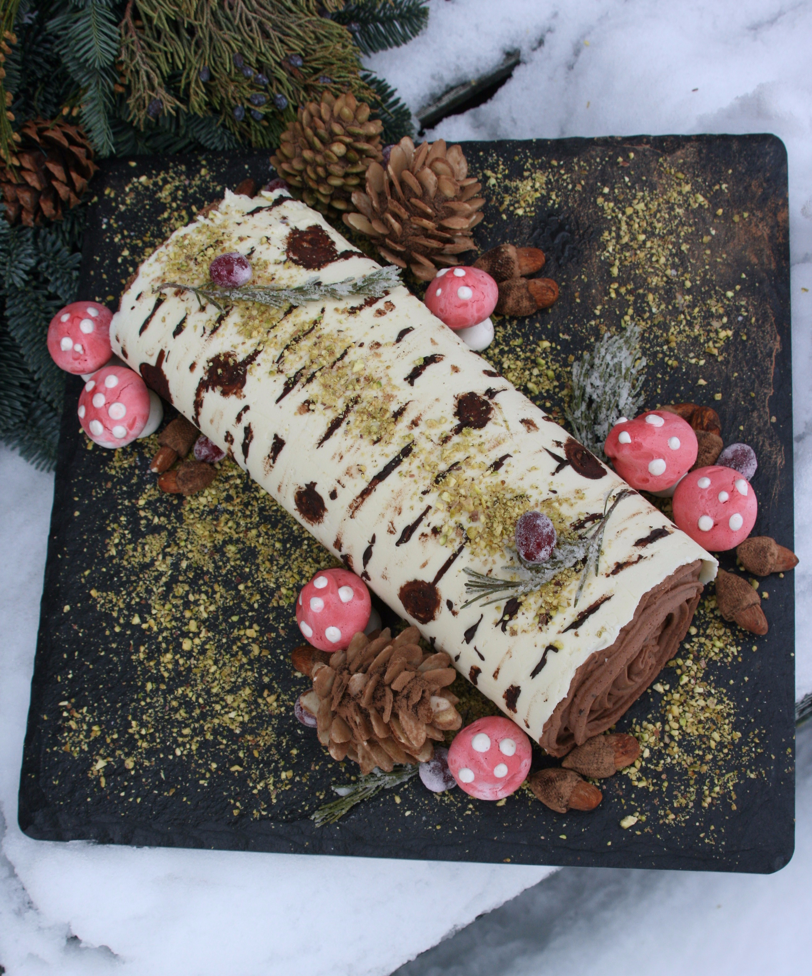 Finally, it was time to put together all the pieces for my showstopper. I gathered everything I had prepared: the mushrooms, pine cones and acorns; some ground pistachios for a little “moss”; and even leftover sugared cranberries and rosemary sprigs from my Chai-Spiced Orange Cake with Cranberry Curd Filling — anything to make my Bûche de Noël look like it had just fallen onto the forest floor.