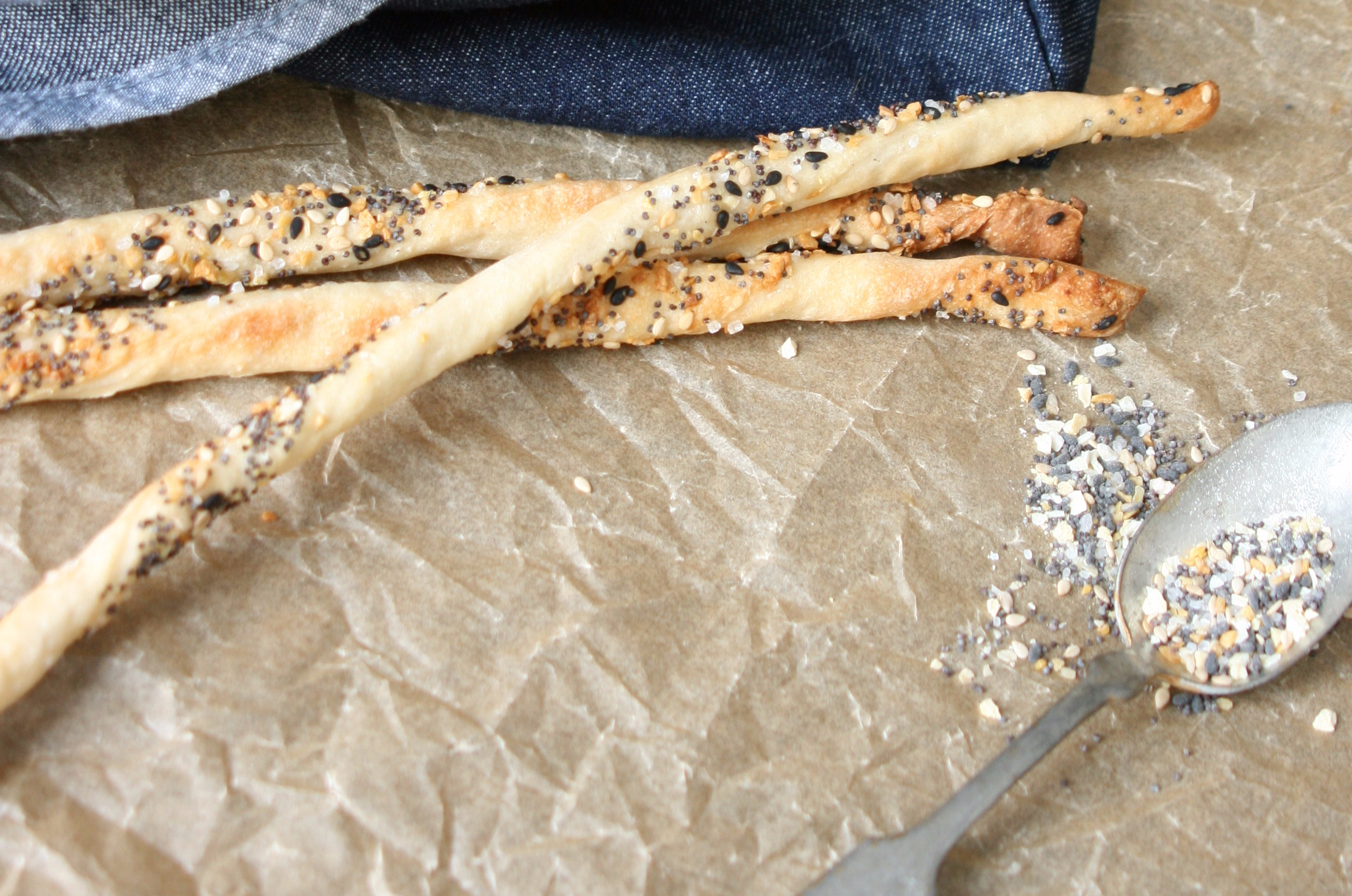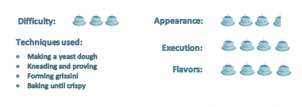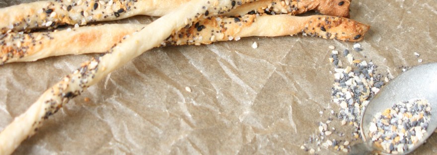 For my grissini, I chose a basic recipe and added my own touch by using a homemade “everything bagel” seasoning mix to flavor the breadsticks. The seasoning mix recipe came from TwoPeasAndTheirPod.com. The only change I made was to use coarse sea salt instead of flaked (because that’s what I had on hand). In the future, I would definitely use flaked, or reduce the amount of salt altogether, as the end result tasted more like a pretzel due to its saltiness.