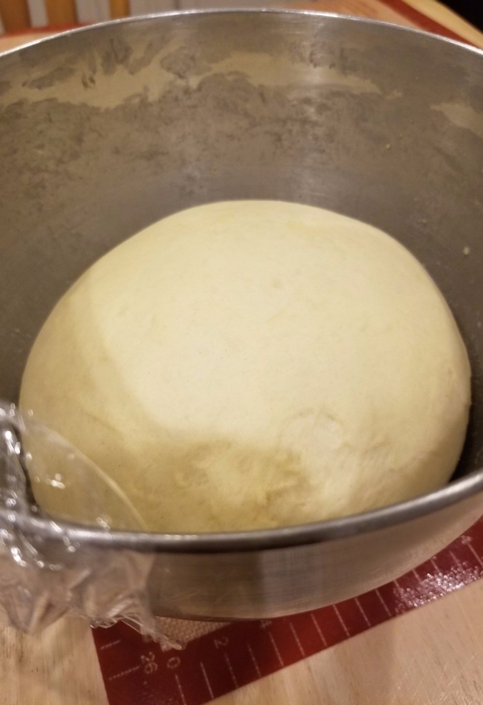 - Lightly oil a large bowl and place dough into the bowl, turning once to coat it with oil. Cover the bowl with plastic wrap or a dish towel and set in a warm place until the dough is doubled in size, about 2-3 hours. (To check to see if the dough is ready, gently press two fingers into the dough. If an indentation remains, the dough hasn’t risen enough.)
