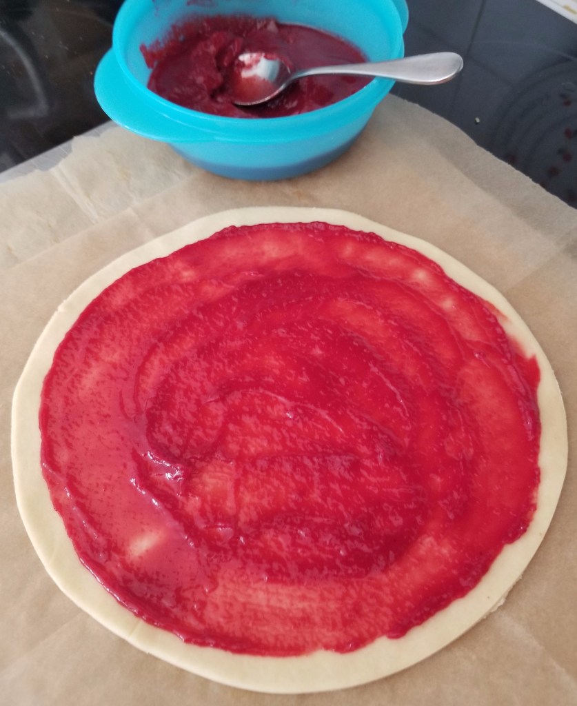 - Dollop a tablespoon of raspberry filling onto the dough circle and spread just about to the edges, adding more filling if needed. (Don’t spread it too thick or it will ooze out when you’re twisting it.)