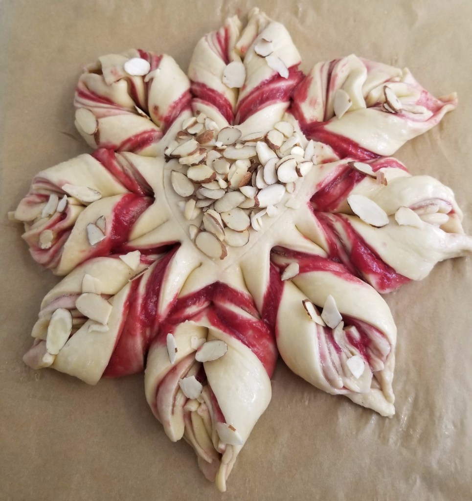 Taking two adjacent sections of dough at a time, I twisted each section away from each other twice and then joined them together at the ends to form a point. By repeating this all the way around I ended up with an eight-pointed star. Covering it with a towel, I let the dough rise one more time, then brushed it with lightly beaten egg white and sprinkled it with sliced almonds before baking it at 350°F for 20-30 minutes.