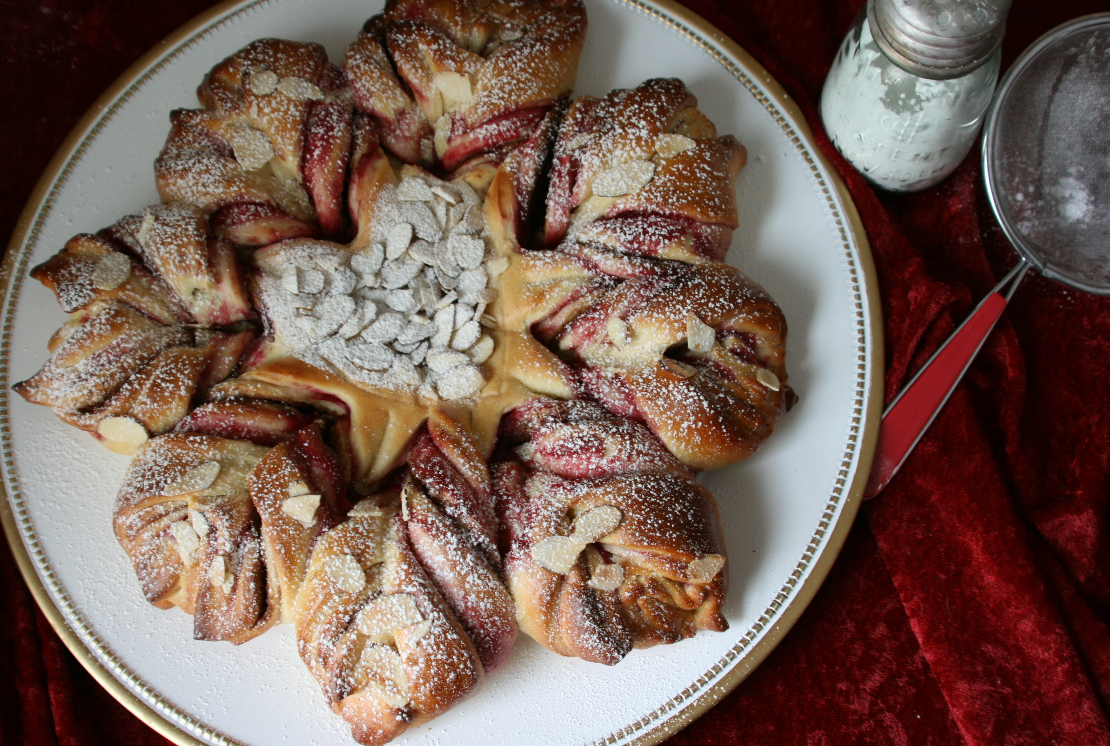 My star bread looked stunning, and the raspberry-chocolate flavor combination is a classic (especially for Valentine’s Day). The only problem was that, while the “points” of the star were well-baked, the center was almost raw. Next time, I will let it bake longer, covering the outer edges with foil if needed in order to prevent them from overbrowning.