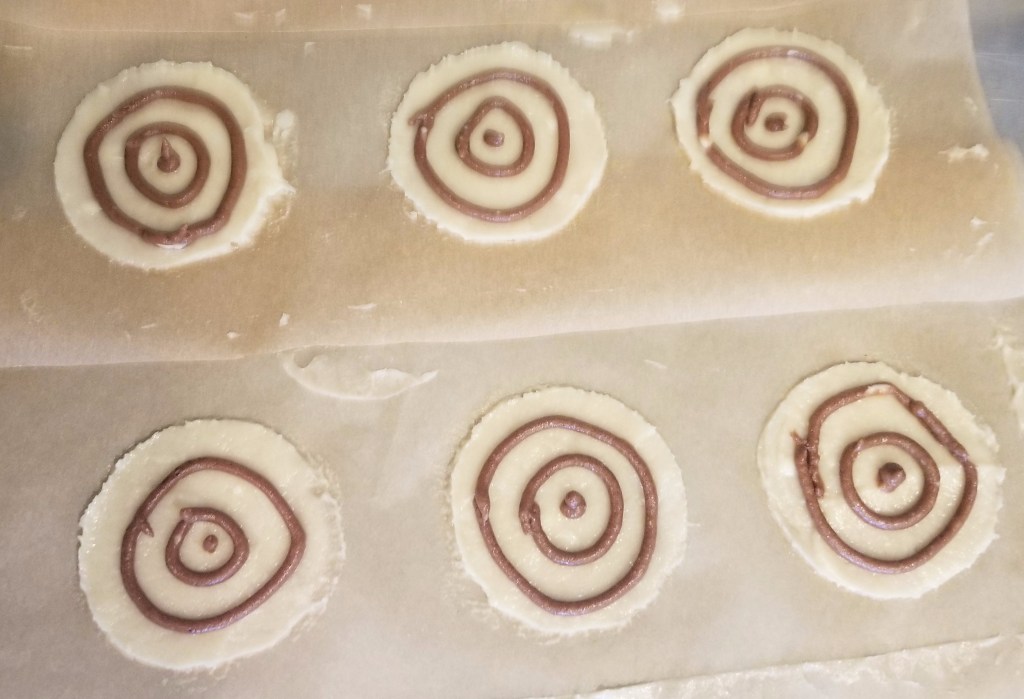 The other tricky part was piping the chocolate circles onto the unbaked tuiles. On this GBBO episode, the bakers weren’t given piping bags, so they had to make them out of parchment paper. Wanting to give myself the same challenge, I tried doing the same thing. While I was able to use my homemade bag for the first batch of tuiles, by the time the second and third batches came along, the paper piping bag was falling apart and the chocolate batter was oozing out the sides and the top! I gave up and grabbed one of my disposable bags instead. (Note: You could use a zip-lock bag for this. Simply snip a small hole in one corner.)
