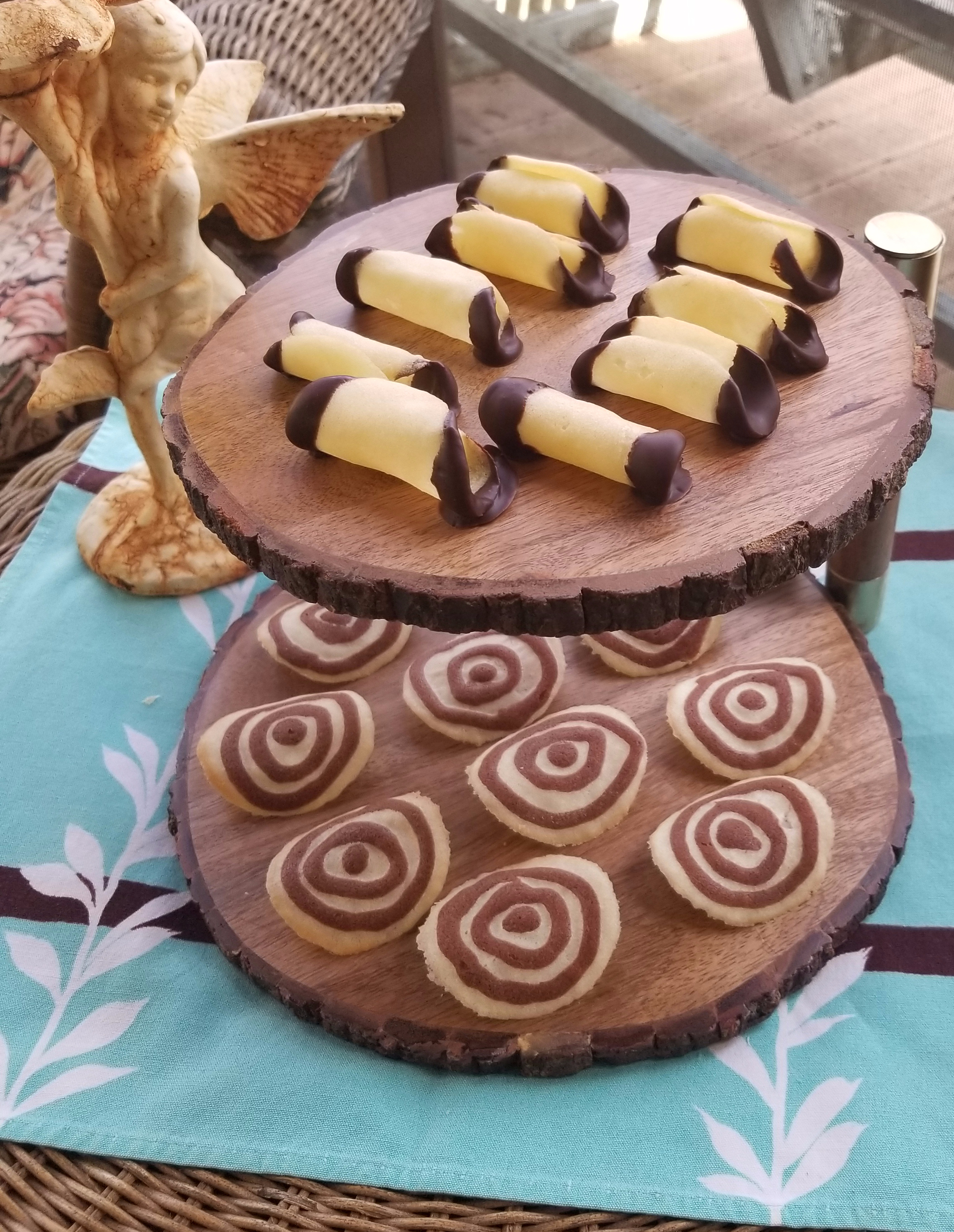 They can be either sweet or savory and are usually served as a garnish, or tuiles can be molded into serving dishes for ice cream or other desserts. There are not many limitations to the shapes these cookies can take. They can be formed into cones, cups, tubes (known as cigars or pirouettes), spirals — you name it. The trick is to form them quickly after they come out of the oven when they are still warm and flexible. Once they have cooled, they should retain the shape and be light and crispy, with a distinct snap when broken. Then they can be filled or dipped in chocolate and ground nuts or simply served plain.