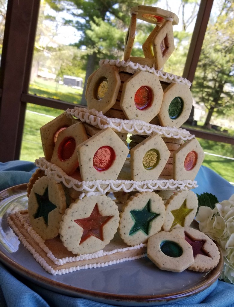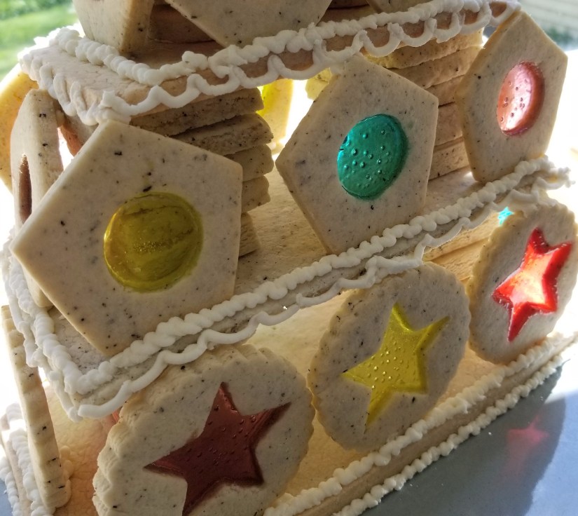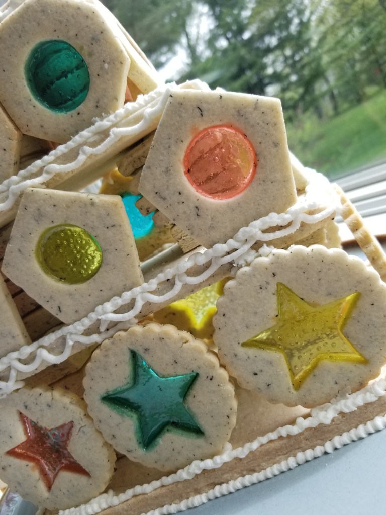 I chose to use shortbread for the structure because it’s very stable and doesn’t spread during baking. For the jeweled biscuits, I used this recipe from PreppyKitchen.com, also basically a shortbread cookie, but it has two eggs added to the mixture, which I found did cause some spreading, so in the future I would probably just use regular shortbread.