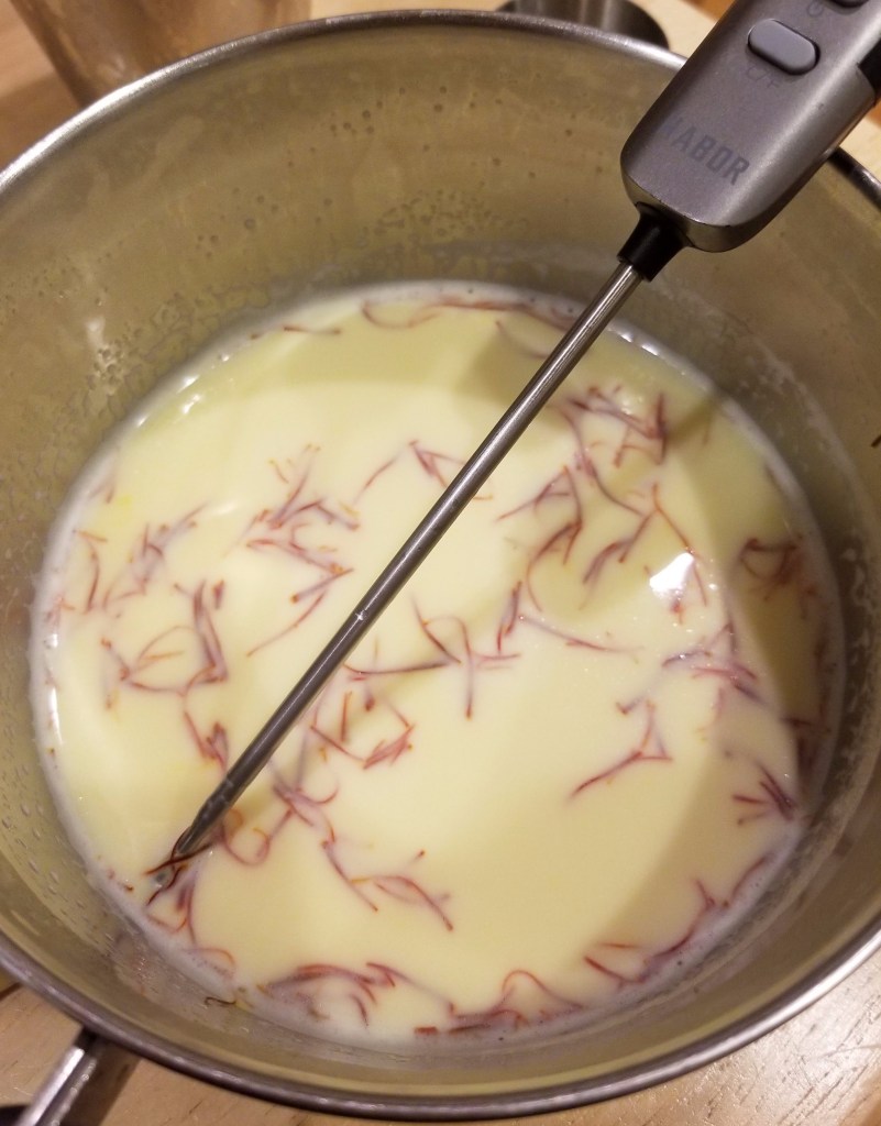 1. In a small pan, heat the milk, saffron and 1 teaspoon sugar until steamy. Remove from heat and stir to dissolve the sugar. Cool to 115ยฐF, or warm to the touch but not hot.