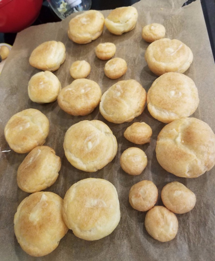 Because we’re making choux “nuns,” I piped eight 2-inch disks and eight 1-inch disks onto parchment paper. I baked them at 425°F for 10 minutes and then turned down the temperature to 375°F and baked them for another 10-15 minutes. When they were golden brown, I pulled them out of the oven, pricked each one with a skewer to let the steam escape and put them back into the oven for a few more minutes to dry them out a bit.