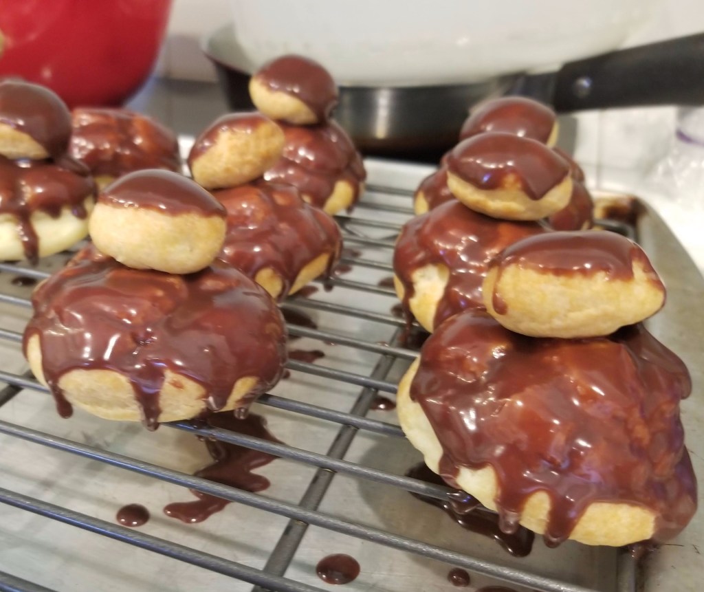Mary’s crème pâtissière recipe calls for a little bit of flour and a little bit of cornstarch for stability, plus the seeds of a whole vanilla bean for deliciousness! Once the choux buns were baked and cooled, I enlarged the holes that I created to let the steam escape and used a small piping tip to fill the buns with pastry cream. I then made a chocolate ganache to dip them in and placed one small choux bun on top of each of the larger buns to create my nuns. For a crowning touch, I piped whipped cream around the “necks” of the nuns to form the collar of their habits, resulting in eight delicious, happy little religieuses!
