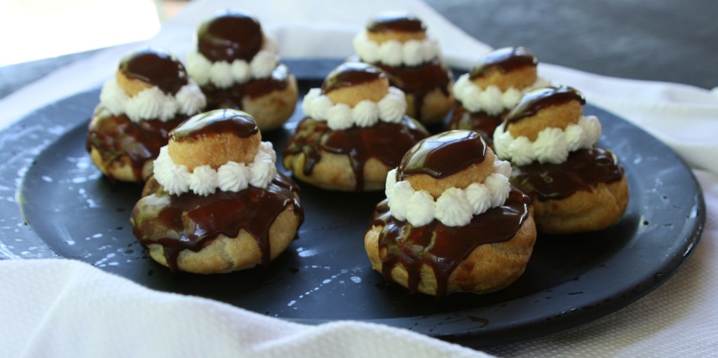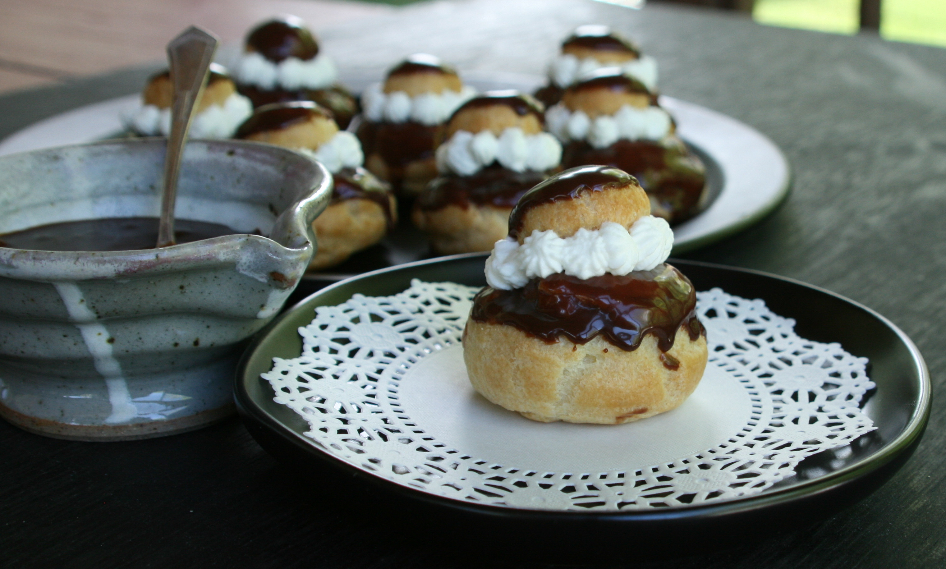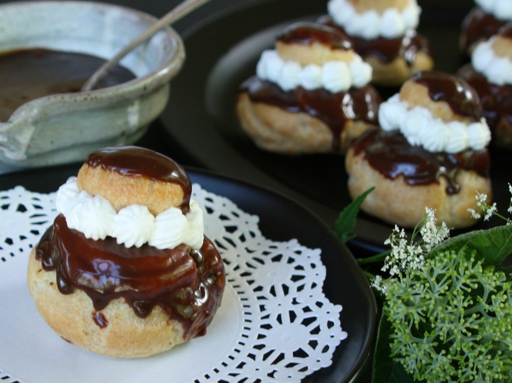 The basic method involves combining water and butter in a saucepan and bringing it to a boil; you then add the flour all at once and stir until it all comes together in a ball, remove from heat and cool slightly before adding eggs, a little at a time, stirring well after each addition. When all the eggs are incorporated, the dough should be smooth, shiny and stiff enough to pipe. Once piped onto a parchment paper–lined baking sheet, the dough is baked at a high temperature for a short amount of time; then the temperature is lowered to finish baking. The idea is that the water in the dough turns to steam in the oven, which causes the dough to puff up, creating air pockets that can then be filled with pastry cream, whipped cream or decadently flavored mousse.