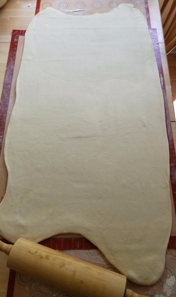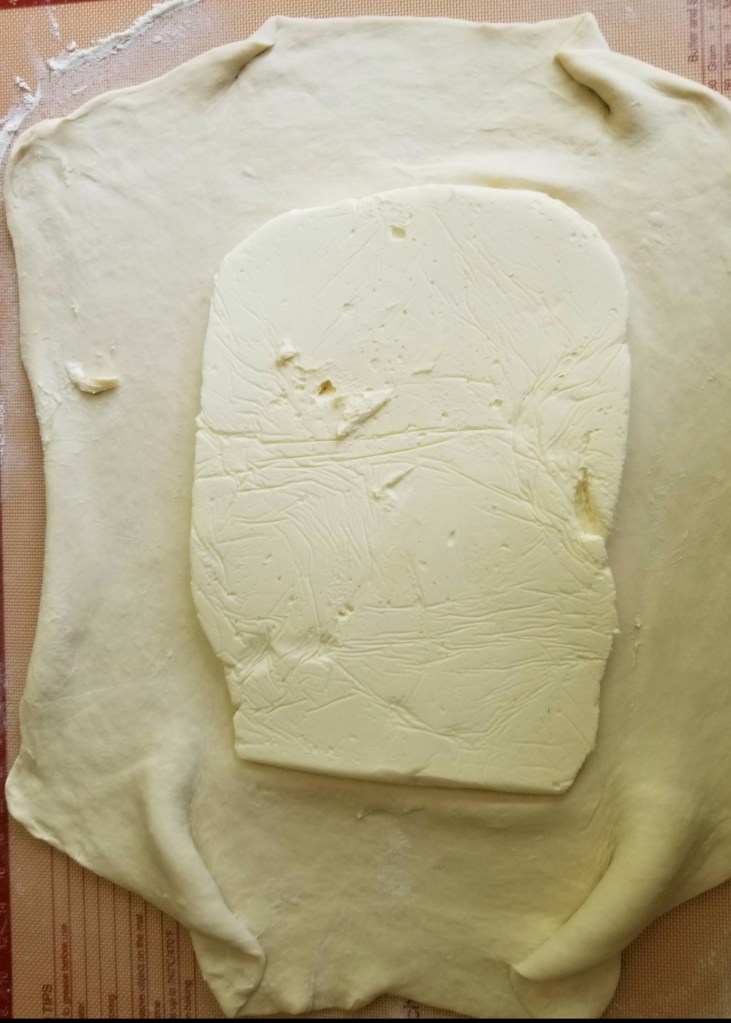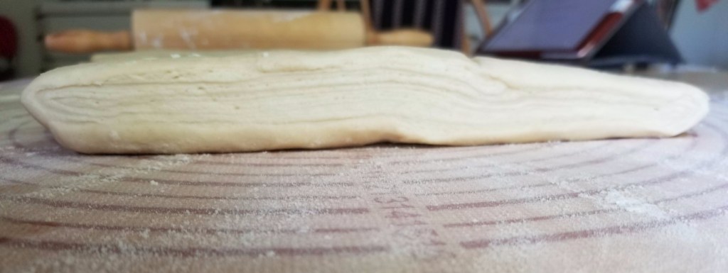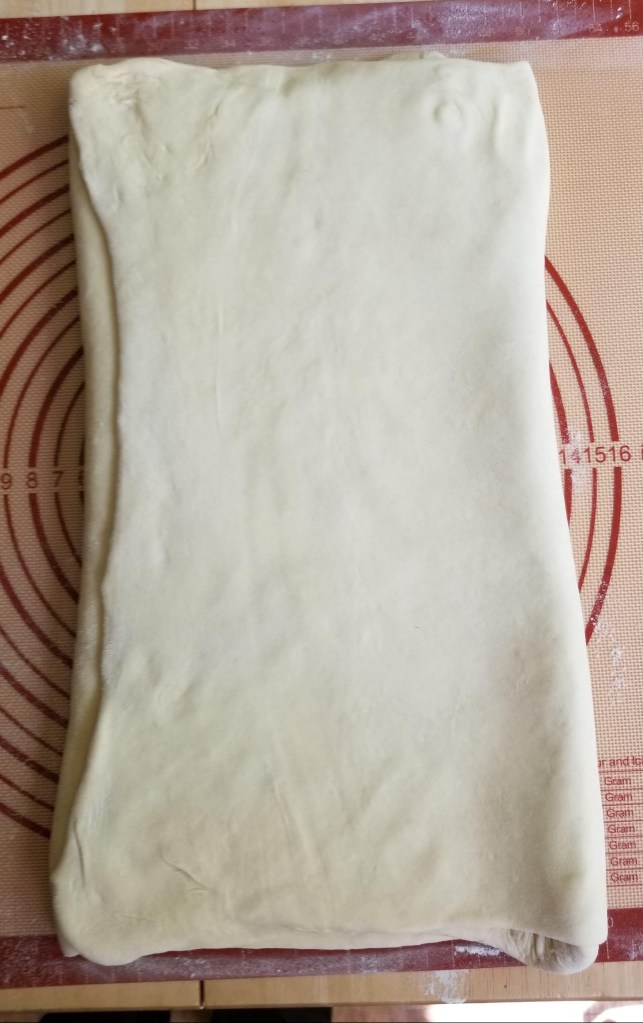 - Lightly flour your surface. With the side of a rolling pin, hit or firmly tap the dough (and enclosed butter) into a rectangle. Once the rectangle has taken shape and the butter has softened a bit, roll the dough to shape it into an elongated rectangle about ¼-inch thick. Turn the dough several times while you roll it, and dust the work surface with more flour as needed to prevent the dough from sticking. (This is where my dough got too big for my pastry mat. Once I rolled it out the first time, I divided it in half and then took turns rolling, folding and chilling each half.)