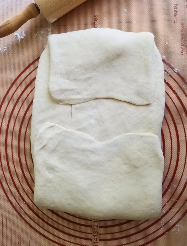 - Straighten the edges of the rectangle with your hands. Then fold the rectangle into thirds, like you would a letter—folding one short side in one third of the way, then folding the other short side over it to form three layers. Brush off any excess flour as you fold, and align the edges as neatly as possible. This is the first turn.