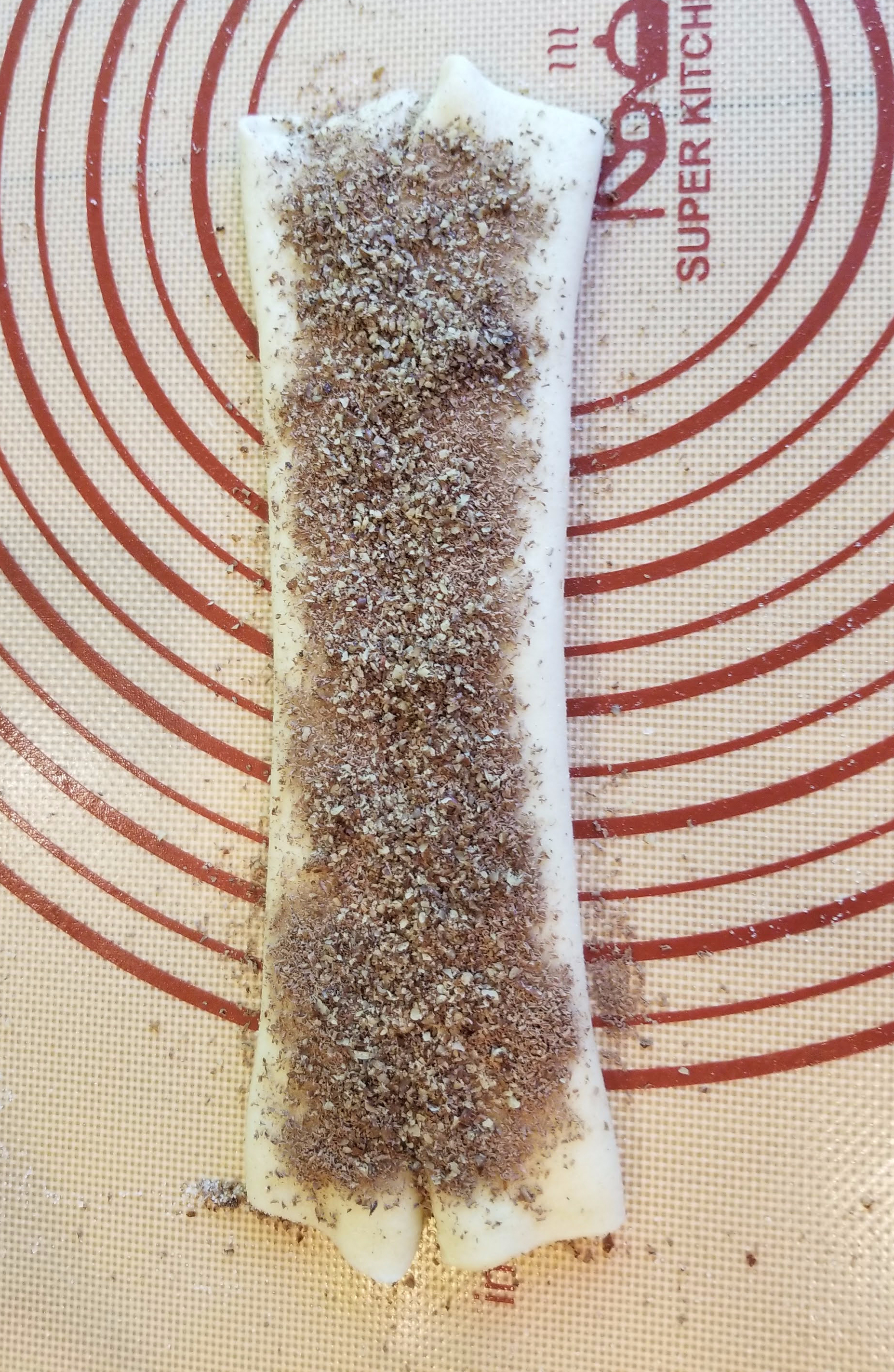 - Spread 2 tablespoons of the sugar-salt mixture onto a clean work surface and, on top of the sugar, roll out half the dough into a 12-inch square (approximately). Sprinkle 2 more tablespoons of the sugar mixture on top, and lightly roll it into the dough with the rolling pin so that both sides of the dough are evenly coated. Sprinkle 1 tablespoon chocolate and 1 tablespoon ground nuts over the dough as evenly as possible.