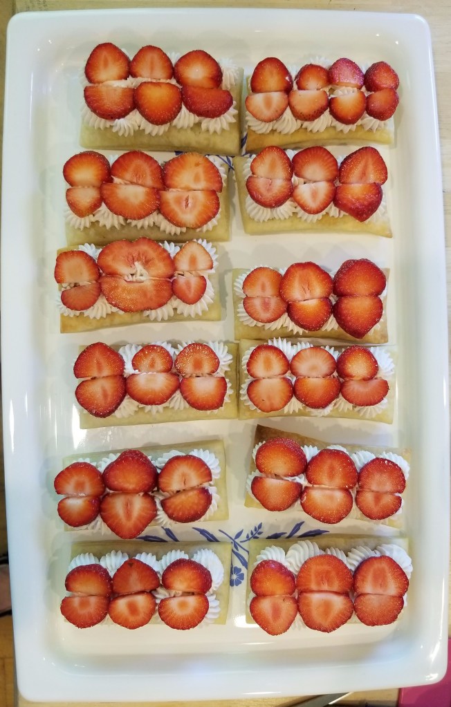 - To assemble, arrange one third of the puff pastry rectangles on a serving platter. Pipe dots of cream to cover each rectangle, then arrange sliced berries on top of cream in a single layer. Add a couple small dollops of cream on top. (This will help the next layer of pastry remain in place.) Place another pastry rectangle on top of the berries and cream and repeat with dots of cream, berries and a couple small dollops. Top each with a third rectangle of pastry.