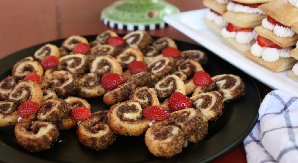 Because the week I made these fell toward the end of Wisconsin strawberry season, I wanted to celebrate this short but oh-so-flavorful season with strawberry-themed pastries. I chose to make strawberry mille-feuilles with basil-infused mascarpone cream, strawberry Nutella turnovers and chocolate pecan palmiers. (Okay, the palmiers aren’t strawberry-themed, but I “glued” them together with royal icing to make palmier butterflies and garnished each one with a strawberry heart!)