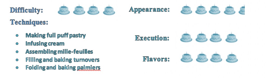 I must say, biting into a freshly made mille-feuille reminded me of the fresh pastries one gets in the patisseries of Paris! In fact, all my pastries turned out pretty tasty. The mille-feuilles are best eaten the same day they’re made, since the cream will soften the pastry. The turnovers will keep a little longer, but they don’t remain as crisp and flaky on day two. The palmiers keep nicely in an airtight container for up to a week, if they last that long!