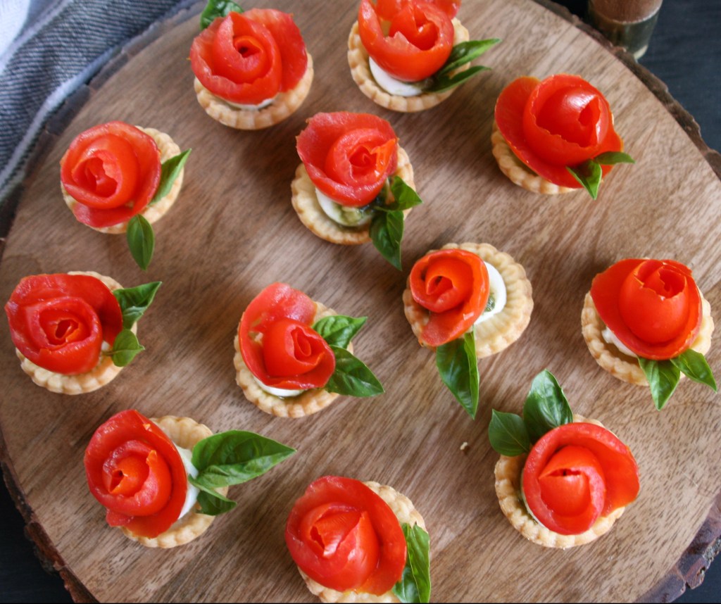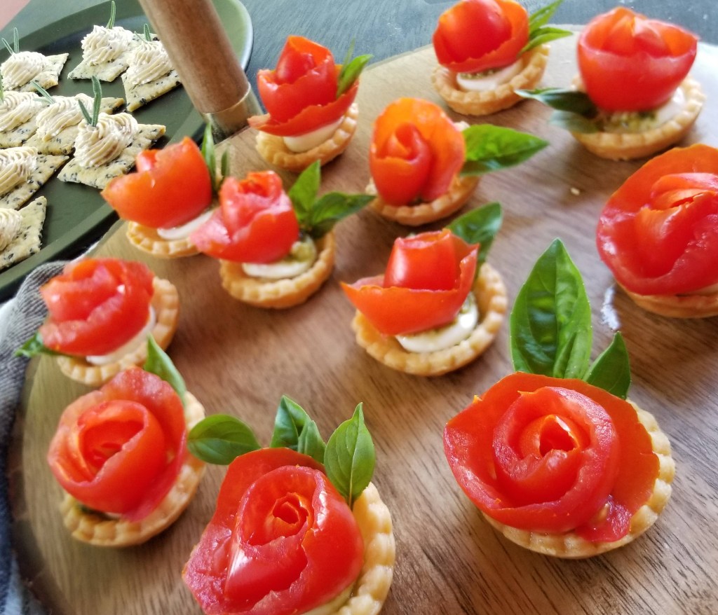 Tomato rosettes are a festive way to use tomatoes as garnish. I followed the video instructions here. All you need to do is, using a paring knife, peel a tomato in one long, thick peel and roll the peel up into a tight spiral. Then, when you flip the spiral over, it looks like a tight rosebud. In addition, I garnished each tartlet with a small basil leaf from my garden.