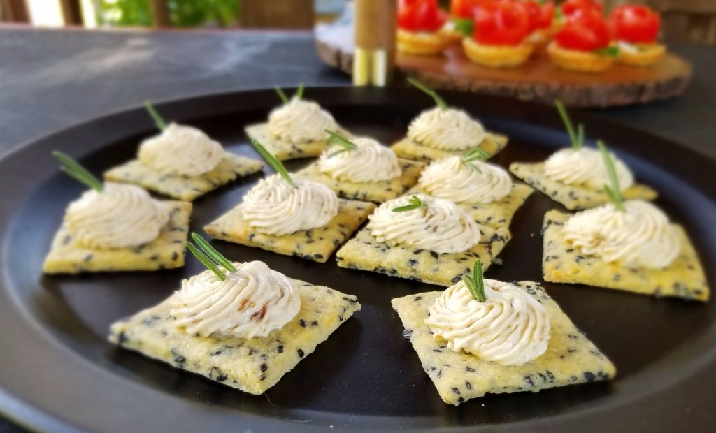 The fig-and-goat-cheese spread came from this recipe. I thought the sweetness of the fig would pare well with the goat cheese and offset the saltiness of the crackers. After piping a swirl of the spread onto each cracker, I garnished them with fresh rosemary, which leaves a nice finish on the palate. Although one reviewer thought the combination resulted in “too much cheese,” others responded with “there’s no such thing!” So I suppose it comes down to personal taste.
