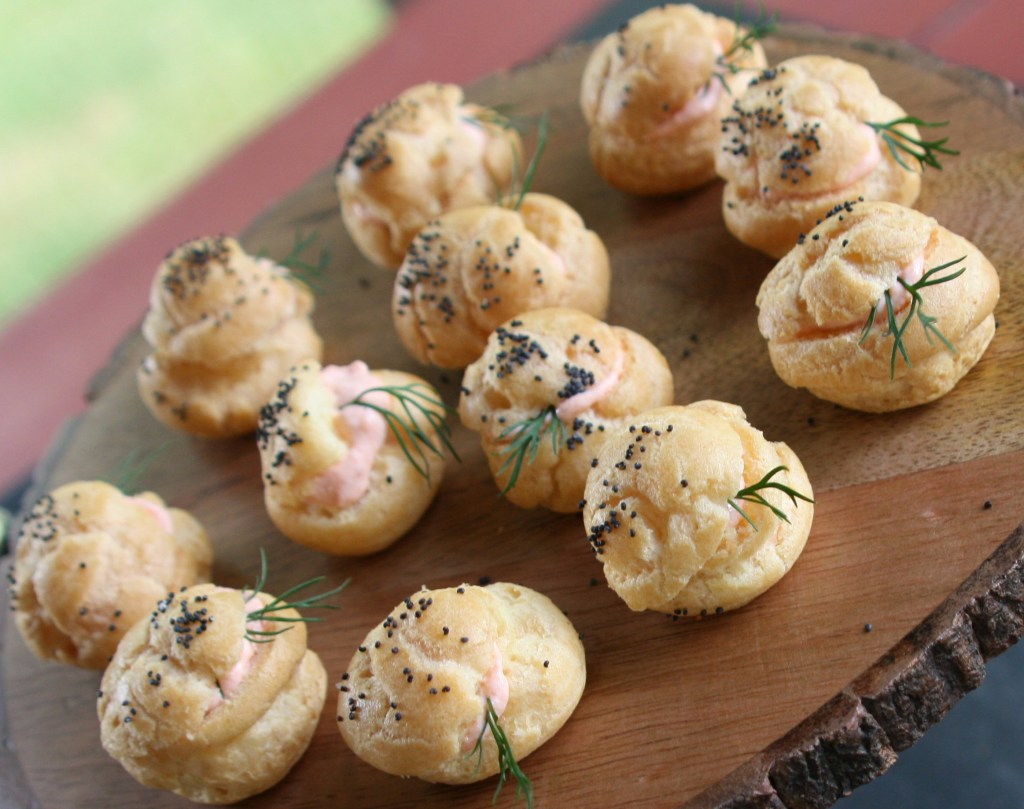 The smoked salmon puffs came from a recipe on FoodAndWine.com. It’s a simple choux pastry recipe with a salmon cream cheese filling, but it makes way more than 12 puffs, so I may cut the recipe in half for you, my blog readers. Still, it was tasty, and the fresh dill made a refreshing addition to the flavor profile. In fact, my daughter requested that I add more dill next time!