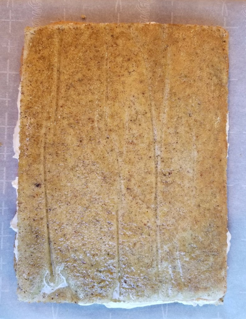 7. Refrigerate the cake for at least an hour. Before serving, remove cake from fridge, heat a long knife under hot water, then wipe it dry, and cut off the edges on all four sides of the cake, keeping the edges as straight and even as possible, wiping the knife on a paper towel between cuts and reheating with water, then drying on a towel, if needed.