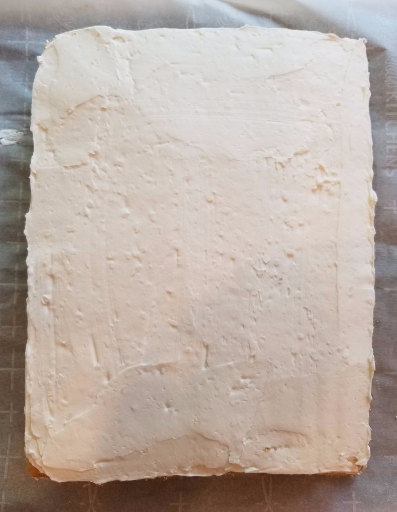 3. Divide the batter into two 10-by-15-inch jellyroll pans and spread it evenly. Bake at 375°F for about 12 minutes or until it starts to turn a light golden color on top. Don’t let it get too dark. Remove from oven and turn out onto cooling racks. Cool completely before assembling, or store in refrigerator or freezer until ready to assemble.
