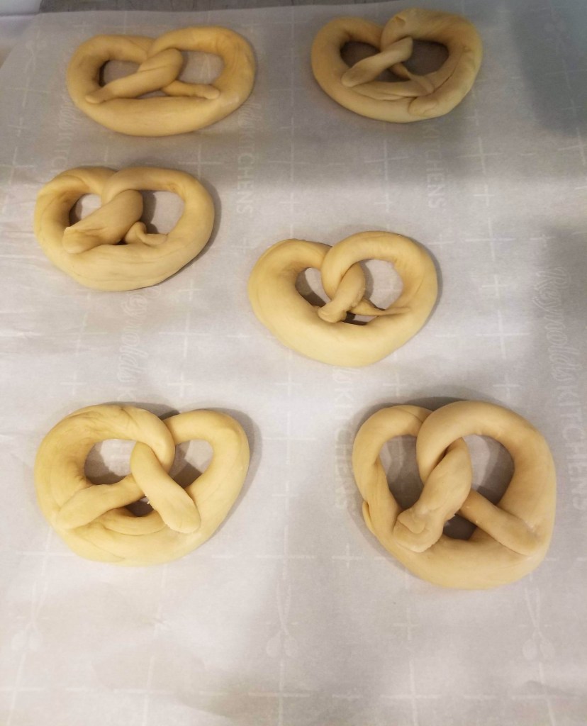 - Repeat rolling and shaping for all six plain pretzels. Then do the same with the sweet pretzels. Work quickly to shape all 12 pretzels.