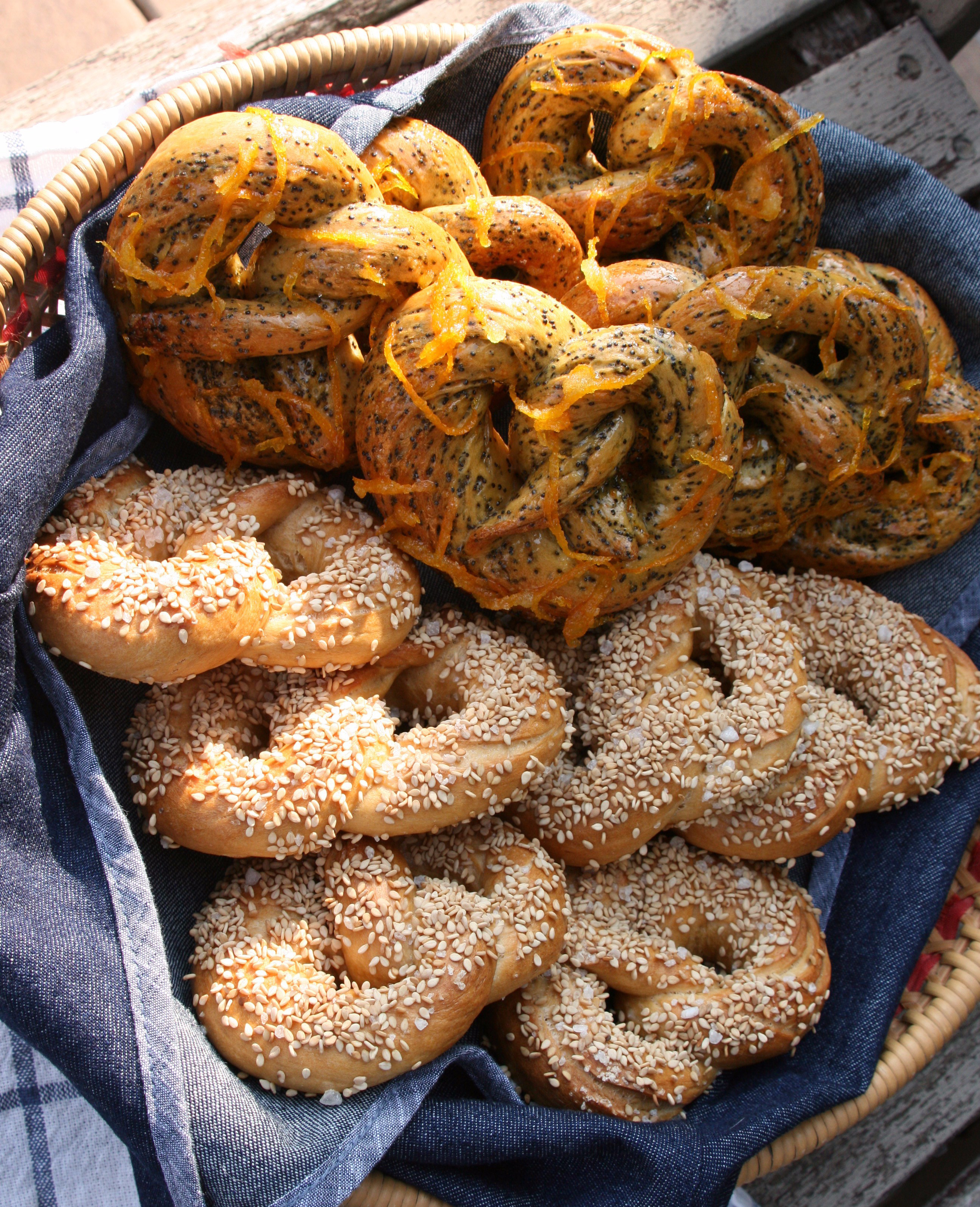 For the orange-and-poppy-seed pretzels, you’ll need to make an orange glaze while the pretzels are baking. While it’s boiling, add thin pieces of orange peel to the syrup. After a minute or two, scoop out the peel and toss it in sugar. When the pretzels come out of the oven, brush them with the glaze and sprinkle the candied peel on top.