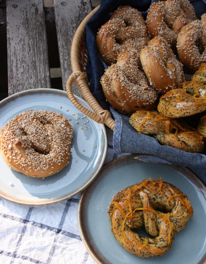 - When the water on the stove is boiling and the pretzels are shaped, add the baking soda to the boiling water. (Be careful, it might boil over.) Working with the plain bagels first, gently drop each pretzel into the boiling water for about five seconds. If they drop to the bottom, they should pop up momentarily. Gently remove them with a slotted spoon and place them on a parchment-lined baking tray, keeping the flavored pretzels separate from the plain ones. While the plain pretzels are still wet, sprinkle them with the rock salt and sesame seeds.
