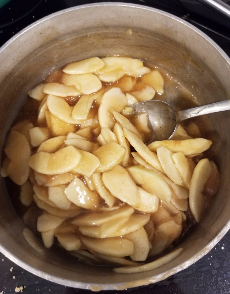 - To make the apple filling, toss sliced apples and lemon juice in a large bowl and set aside. In a large saucepan, combine sugars, cornstarch, spices and salt. Pour in water and whisk to dissolve the sugars. Bring to a boil over medium heat and cook for 2 minutes, stirring occasionally. Add apples and bring back to a boil. Simmer, stirring occasionally, until apples are tender (10-15 minutes). Cool completely, then spread on top of caramel filling. Place second cake layer on top of apple filling.